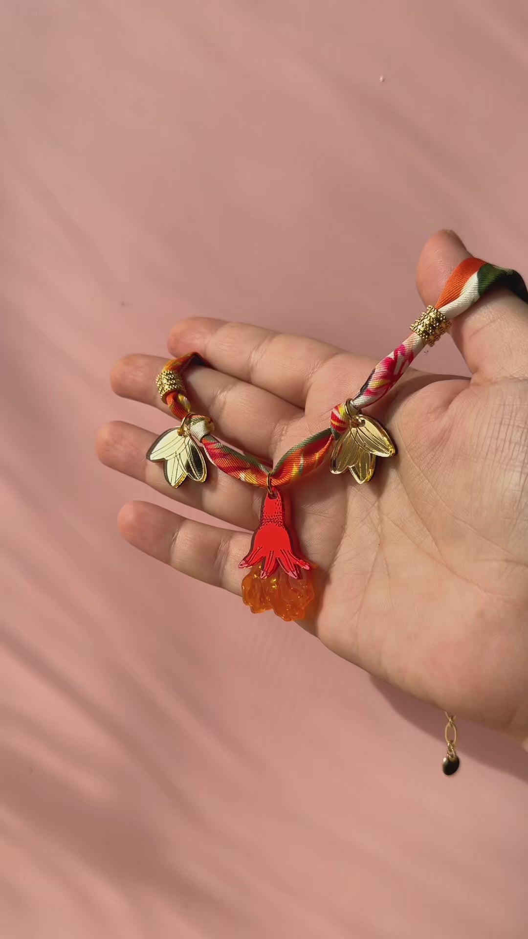 Un collier fait main qui s'épanouit à la clavicule - une fleur de grenadier en acrylique vif, suspendue à un cordon imprimé tropical.