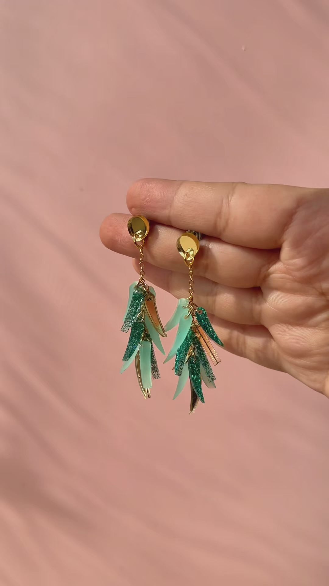 Portez-les une fois et vous comprendrez pourquoi tous les regards se tournent vers vous. Les boucles Tuft sont une cascade de feuilles en acrylique courbées qui pendent d'une délicate chaîne dorée, se balançant librement à chaque pas comme de petites palmes portées par une brise chaude. Choisissez parmi quatre personnalités distinctes : le noir écaille pour un look sauvage et graphique ; le blanc translucide aux veinures dorées chaudes pour un éclat subtil ; le tropic en orange vif et fuchsia pour un clash de couleurs plein volume ; et le lagoon, un mélange de menthe givrée et de paillettes bleu sarcelle qui semble tout droit sorti des fonds marins.
