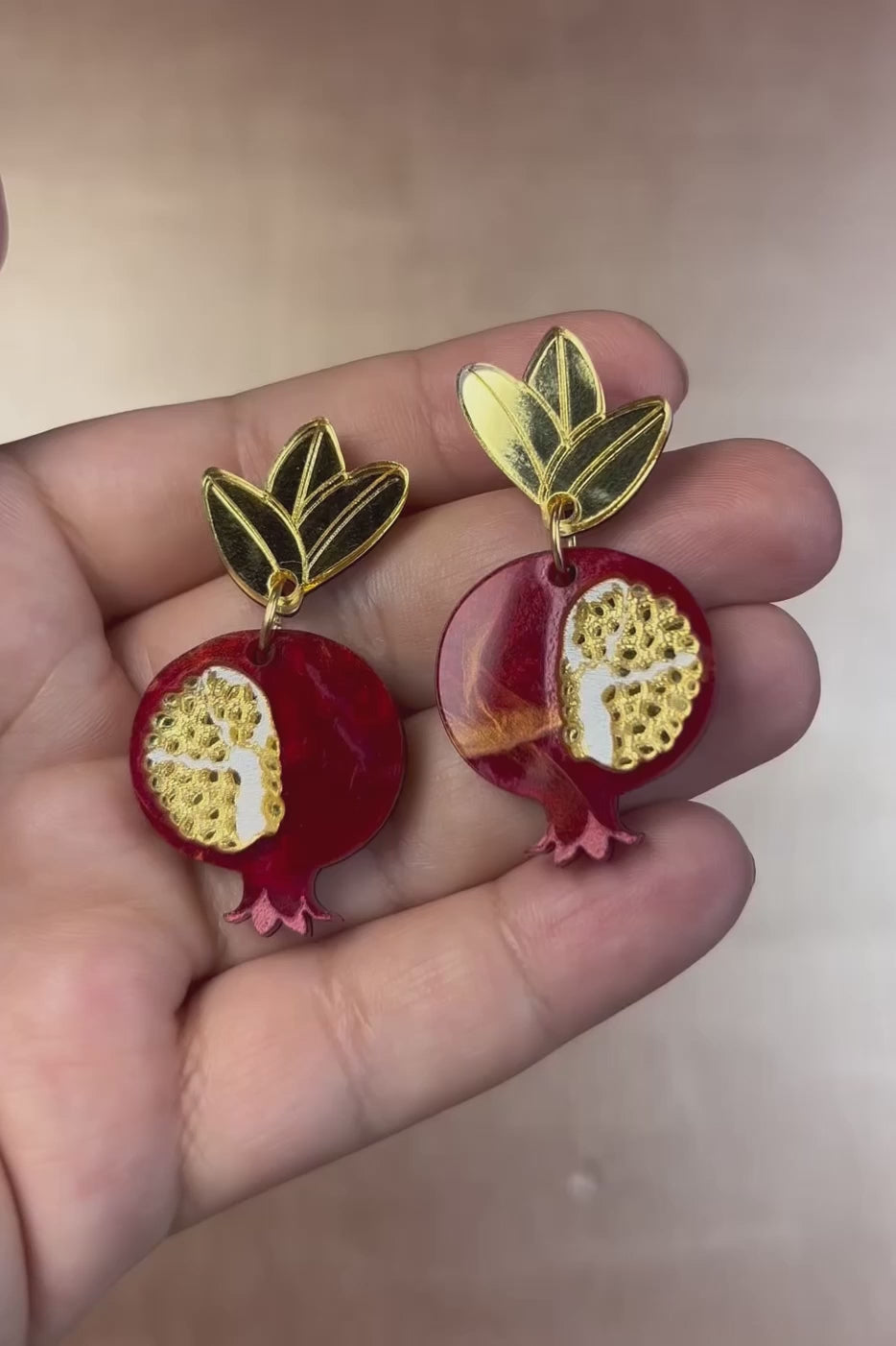 • Design Unique : Boucles d'oreilles pendantes de taille moyenne avec un pendentif grenade rouge audacieux aux graines dorées apparentes, surmonté de feuilles miroir dorées éclatantes.