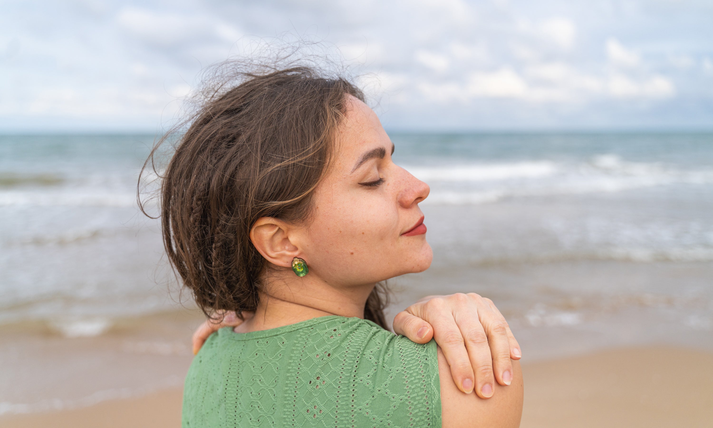 A woman with long, brown dreadlocks and rainbow rhinestone earrings stands outdoors with her eyes closed, wearing a light blue blouse, appearing calm and peaceful.