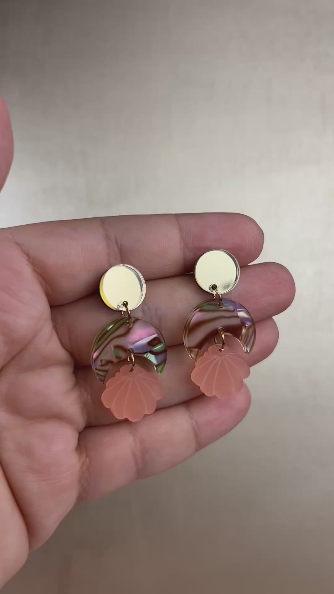 A pair of lightweight, handmade Seashell Earrings featuring round mirrored studs, marbled pink and brown circles, and pink shell-shaped pendants, displayed on a light surface with soft shadows.
